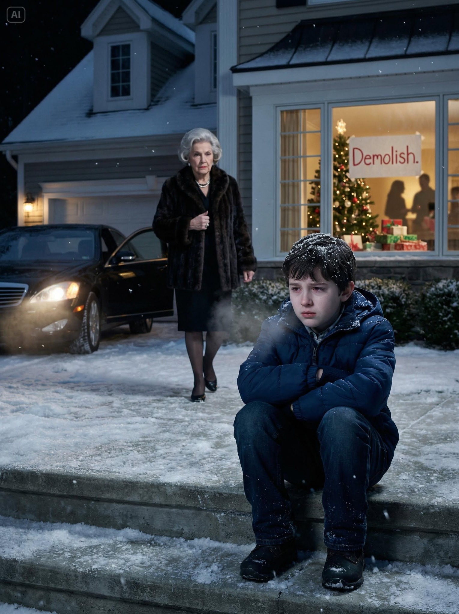 THE SNOW WAS UP TO MY ANKLES AND THE WIND CUT MY SKIN, MY STEPFATHER SHOVED ME OUT ON THE PORCH FOR “RUINING THE HOLIDAY MOOD,” I HEARD THEM LAUGH OVER GIFTS FROM BEHIND THE WALL, AND THEN A PRIVATE HELICOPTER LANDED—MY AUNT, A TECH TYCOON, STEPPED OUT, TOOK ONE LOOK AT ME, GLANCED AT THE HOUSE, AND SAID ONE WORD: ENOUGH.