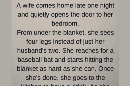 A wife comes home late one night and quietly opens the bedroom door.Peeking under the blanket, she sees four legs instead of two. Grabbing a baseball bat, she starts swinging wildly at the bed, then storms into the kitchen to…