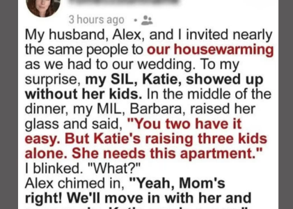 At Our Housewarming, My Husband and MIL Demanded We Give Our Apartment to His Sister – My Mom’s Response Shut Them Down They say your first home as a couple is where your future begins. For Alex and me, it…