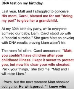 At my 30th birthday party, my mother-in-law, Carol, unveiled DNA test results, claiming my baby wasn’t my husband’s. Her plan to expose a scandal and destroy our marriage backfired spectacularly when my husband, Matt, confronted her. Carol had known since…
