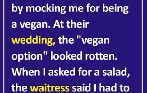 My son married a woman I barely know; we met days before the wedding. She mocked my veganism early on, but I attended for him—he’s my world. No assigned seating. I sat at the “vegan option” table. The plate arrived:…