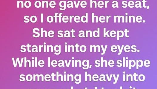 Seven months pregnant, I rode the bus home, exhausted. An older woman boarded; I stood, offering my seat. She smiled warmly, settling beside me, glancing over with quiet recognition. At her stop, she rose, then slipped something cool and metallic…