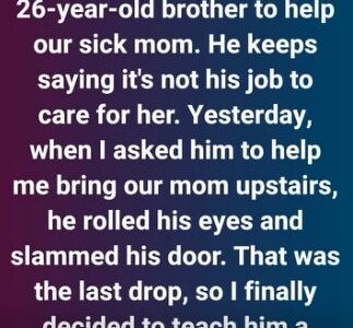 I live with my unemployed 26-year-old brother to help our sick mom. He keeps saying it’s not his job to care for her. Yesterday, when I asked him to help me bring our mom upstairs, he rolled his eyes and…