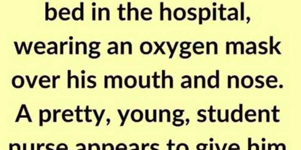 A male patient is lying in bed in the hospital, wearing an oxygen mask over his mouth and nose. A pretty, young, student nurse appears to give him a partial sponge bath. ‘Nurse’, he mumbles, from behind the mask. ‘Are…