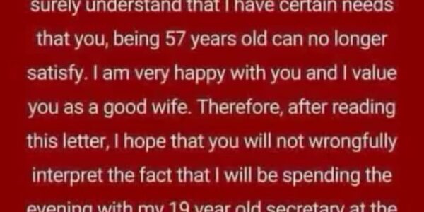 A wife finds a note from her husband on the fridge one morning: Husband’s Note “My dear wife, You will surely understand that I have certain needs that you, being 57 years old, can no longer satisfy. I am very…