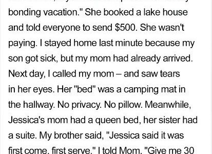 When my sister-in-law Jessica invited us all on a “dream family vacation” to a lake house, my mom was thrilled. She paid her $500 share with excitement, happy to spend time with her children and grandkids. But just two days…
