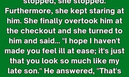 A young man noticed an elderly lady following him around while shopping in a supermarket. She stopped when he stopped and kept staring at him. Eventually, at the checkout, she approached him and said, “I hope I haven’t made you…