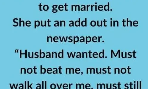 “Husband wanted. Must not beat me, must not walk all over me, must still be good in bed” She got many applicants but after a few weeks she didn’t find anybody suitable. She was about to give up, when she…