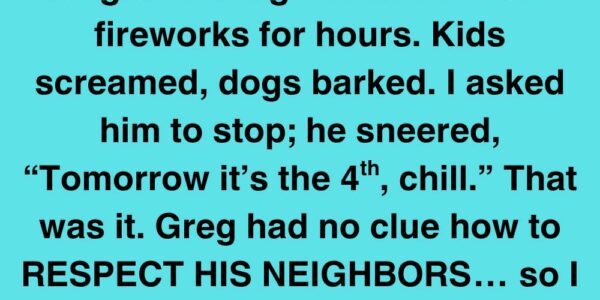 This time, at midnight, new neighbor Greg set off massive fireworks for hours. Kids screamed, dogs barked. I asked him to stop; he sneered, “Tomorrow it’s the 4th, chill.” That was it. Greg had no clue how to RESPECT HIS…