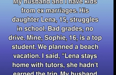 My husband and I have kids from ex marriages. His daughter Lena, 15, struggles in school. Bad grades, no drive. Mine, Sophie, 16, is a top student. We planned a beach vacation. I said, “Lena stays home with tutors, she…