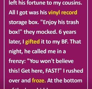 My rich grandpa passed and left all his fortune to my cousins. All I got was his old vinyl record storage box. “Enjoy his trash box!” they mocked me. Six years later, I gifted it to my boyfriend. That night,…