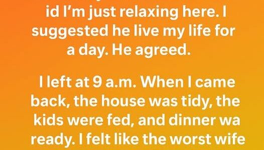 I’m on maternity leave with 2 kids. My husband often said I’m just relaxing here. I suggested he live my life for a day. He agreed. I left at 9 a.m. When I came back, the house was tidy, the…