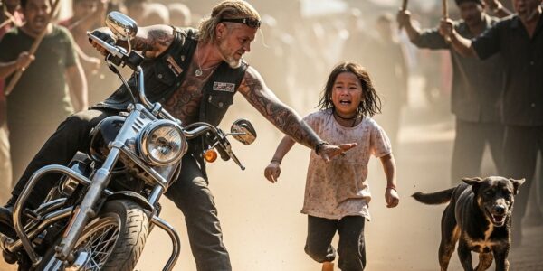 “Stay back!” the biker shouted, throwing his bike sideways to block the road.A small girl, maybe seven, ran barefoot through the dusty village street, tears streaming down her face. Behind her, a stray dog sprinted — muddy, limping, barking desperately….