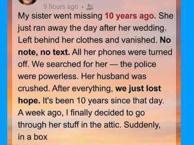 My sister disappeared ten years ago—one day after her wedding. She left behind her clothes, her phone, her entire life. No note. No message. We searched everywhere. The police found nothing. Eventually, hope faded. A week ago, I finally went…