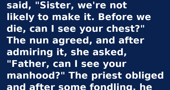 A nun and a priest found themselves stranded in the desert after their camel passed away. The priest, sensing the gravity of the moment, looked at the nun and said, “Sister, it seems we may not survive this.” “Can I…
