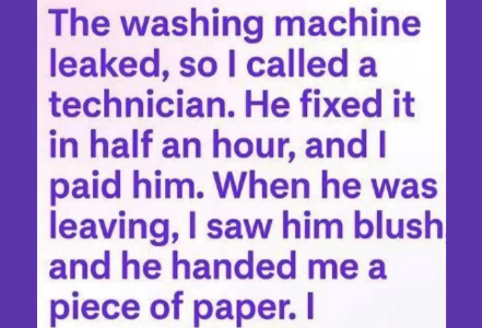 The washing machine leaked, so I called a technician. He fixed it in half an hour and, as he was leaving, handed me a folded note, blushing. Inside, it read: “Thank you for being kind. Most people yell when something…