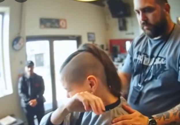 Jake, the barber, had been cutting hair for twenty years. He’d seen nerves before — grooms before weddings, boys before prom, soldiers before deployment — but this was different. He could feel her fear in the way she clutched the chair, the way her eyes stayed glued to her lap. When he made the first pass, locks fell to the floor like quiet confessions. The girl’s breath hitched. Soon, tears slid down her cheeks, glistening under the harsh lights. A few customers looked away; others froze mid-conversation. When the final tuft fell, her reflection was bare, raw, and human. Jake rested a hand on her shoulder. “You’re stronger than you think,” he said gently — but he could tell the words weren’t enough.