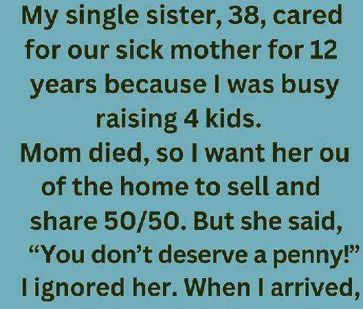 My single sister, 38, cared for our sick mother for 12 years because I was busy raising 4 kids. Mom died, so I want her out of the home to sell and share 50/50. But she said, “You don’t deserve a penny! You were not a devoted daughter!”