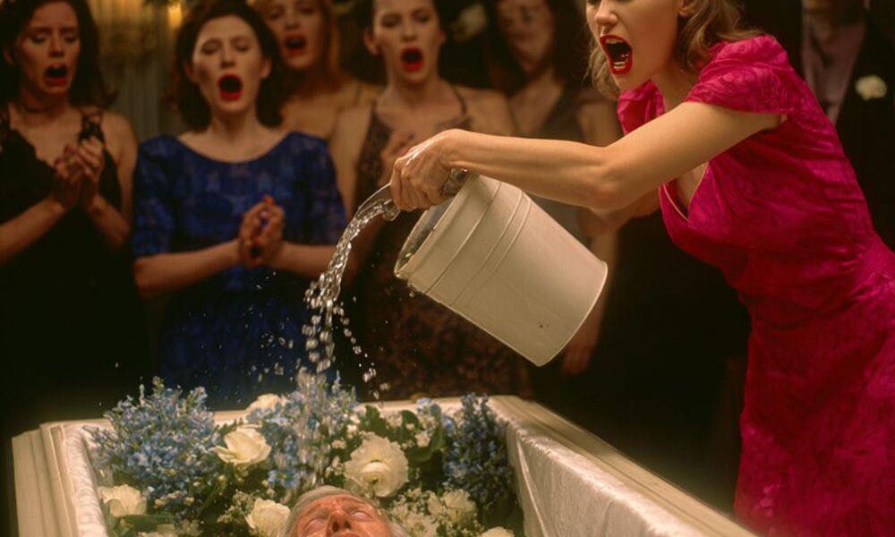 The woman approached her husband’s coffin and tipped the bucket over his face.