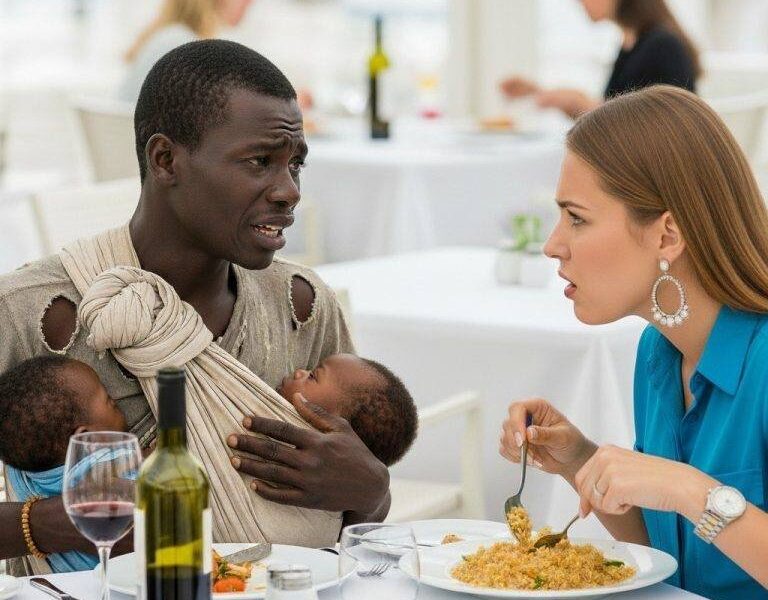 The restaurant went silent. Olivia turned. A man knelt beside her table, soaked from the rain. His jacket was torn, his shoes didn’t match, and dirt streaked his face. But strapped to his chest were two tiny infants, their cheeks pale, their eyes too tired even to cry.