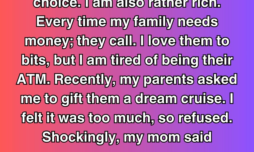 I’m single, childless by choice, and wealthy from years of hard work building a tech startup. My family, whom I love, often asks for money—emergencies, weddings, even my niece’s tuition. I’ve always helped, but recently, my parents requested a dream cruise. Feeling it was too much, I declined. My mom’s response stung: “You wouldn’t understand family. You only have money.” Her words, not the first of their kind, hurt deeply, implying my life choices made me less.