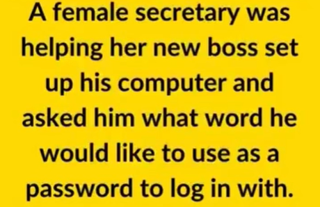 A female secretary was helping her new boss set up his computer and asked him what word he would like to use as a password to log in with.