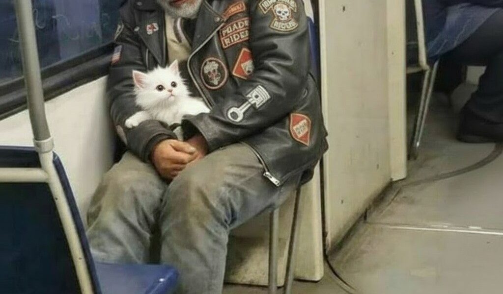 Nobody said anything at first. The train rattled on through the tunnel. The biker wiped his eyes with the back of one hand, still cradling the kitten with the other. It had its tiny paws pressed against his chest, kneading his shirt, completely content.