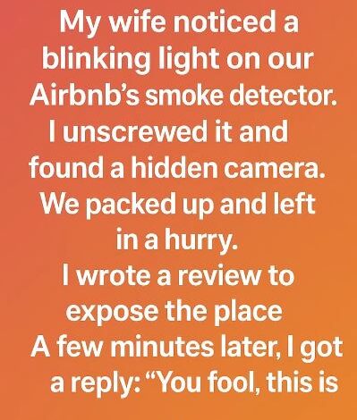 On a getaway, my wife noticed a blinking light on the smoke detector above our bed. Suspecting a hidden camera, I unscrewed it, revealing a suspicious device. Panicked, we packed and fled the rental, horrified at the thought of being recorded. Furious, I left a scathing review warning others. As we drove away, the host messaged