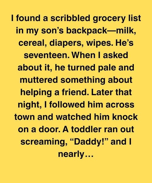 I found a scribbled grocery list in my son’s backpack—milk, cereal, diapers, wipes. He’s seventeen. When I asked about it, he turned pale and muttered something about helping a friend. Later that night, I followed him across town and watched him knock on a door. A toddler ran out screaming, “Daddy!” and I nearly fell off the curb.