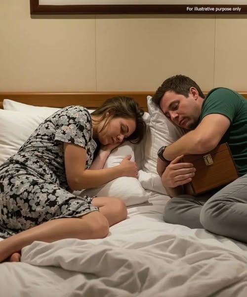 As I woke up that night, the first thing I noticed was the emptiness beside me. The hotel room was dark, painted with thin lines of moonlight filtering through the curtains. Ryan, my new husband, wasn’t holding me like he had fallen asleep doing just hours before. Instead, he was turned away, his broad back slightly hunched, his arms wrapped protectively around something small and wooden.