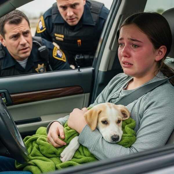 Two officers approached, expecting a joyriding teenager. Instead, they found a trembling twelve-year-old behind the wheel, tears streaking her cheeks, one hand on the wheel and the other bracing a blanket-wrapped puppy.