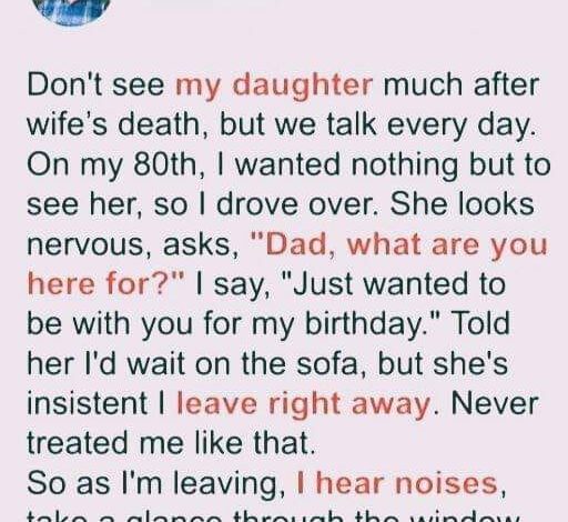 After my wife’s death, I rarely saw my daughter, though we talked daily. On my 80th birthday, I craved only her company, so I drove over. She looked nervous: “Dad, what are you here for?” “Just wanted to be with you,” I said. “I’ll wait on the sofa.” But she insisted I leave—unusual for her.