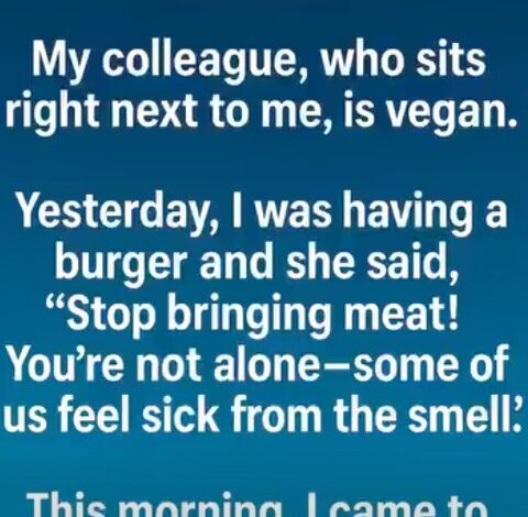 I eat my lunch at my work desk. My colleague, who sits right next to me, is vegan. Yesterday, I was having a burger, and she said gently, “Could you please not bring meat to the desk? The smell makes me feel sick.” Her tone wasn’t harsh, but I could tell it made her uncomfortable. I didn’t know what to say. I wasn’t trying to upset anyone it was just lunch.