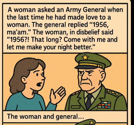 A woman asked an old Army General, “Sir, when was the last time you made love to a woman?”