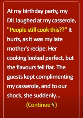 A week later, she offered to cook for guests. I said, “Let’s see if your food speaks louder than your words.” Her plates looked perfect; the taste didn’t. Guests quietly asked for my casserole. “No one makes it like you,” they said.