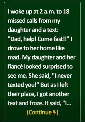 I woke up at 2 a.m. to 18 missed calls from my daughter and a text: “Dad, help! Come fast!!” I drove to her home like mad. My daughter and her fiancé looked surprised to see me. She said, “I never texted you!”