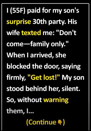 I (55F) paid for my son’s surprise 30th party. His wife texted me: “Don’t come—family only.” When I arrived, she blocked the door, saying firmly, “Get lost!” My son stood behind her, silent.