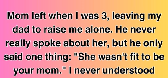 Mom left when I was 3, leaving my dad to raise me alone. He never really spoke about her, but he only said one thing: “She wasn’t fit to be your mom.” I never understood what he meant until one day when I was 18. She came to visit me at my work.