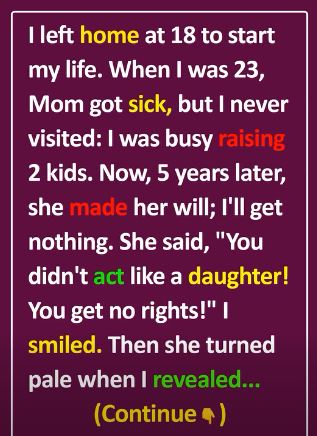 When I was 23, Mom got sick, but I never visited: I was busy raising 2 kids and facing my own struggles. Now, 5 years later, she made her will; I’ll get nothing. No house, no savings, not even a keepsake.
