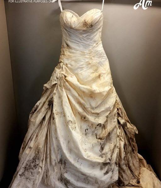 Twenty-five minutes later, Lily stepped back. The stain was hidden beneath a layered asymmetrical drape that looked deliberate. The torn lace at the waist had been replaced with elegant folds and a stitched sash.