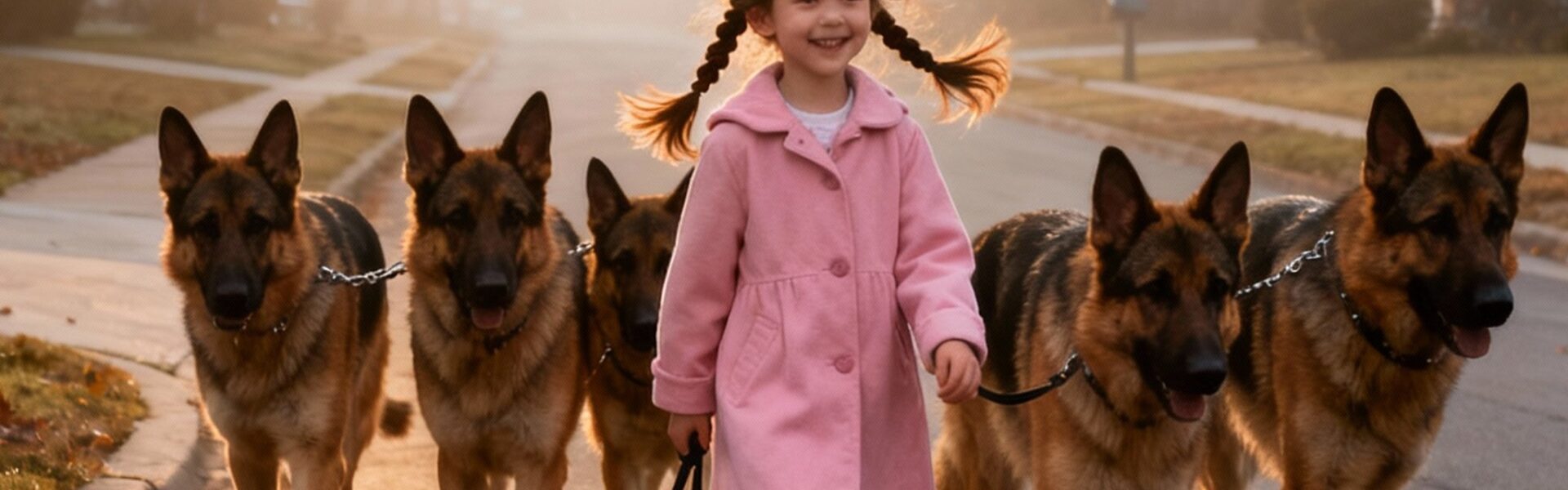 In her pink coat, a young girl, perhaps six years old, went calmly along the sidewalk with five leashes attached to giant German Shepherds.