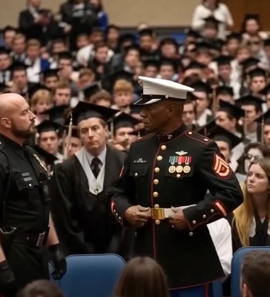 Solomon Dryden arrived quietly, not seeking applause — only a moment. Years of duty had taught him humility, and loss had carved wisdom into his eyes. He took his seat among proud families, holding the memory of his late wife and the pride of seeing his son graduate. The high school gym hummed with anticipation, dreams shimmering in the air. Solomon sat tall in his Marine blues — a living emblem of service, sacrifice, and love.When security approached, suspicion flickering where none belonged, Solomon stayed calm. His steady composure, born of discipline, spoke louder than protest ever could. The chatter fell silent, the crowd uneasy — until someone whispered, “He’s a Marine.” The words spread like sunlight through clouds, melting tension into respect.In that instant, six Navy SEAL veterans rose from different corners of the gym. Fathers and uncles of other graduates, they moved with quiet authority, surrounding Solomon in silent solidarity. The guards hesitated, realizing this was not a disturbance — it was a moment of unity.