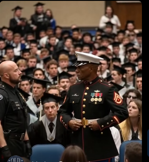 Solomon Dryden hadn’t come to make an entrance — he came to keep a promise. The retired Marine drove through dawn’s gray light, his uniform pressed, his wife’s photo tucked near his heart. His son Tyran’s high-school graduation wasn’t just another ceremony; it was a testament to the sacrifices stitched through their family’s story. Every medal Solomon wore whispered of duty and loss, but today was about triumph — his son’s, and, in some quiet way, his own.