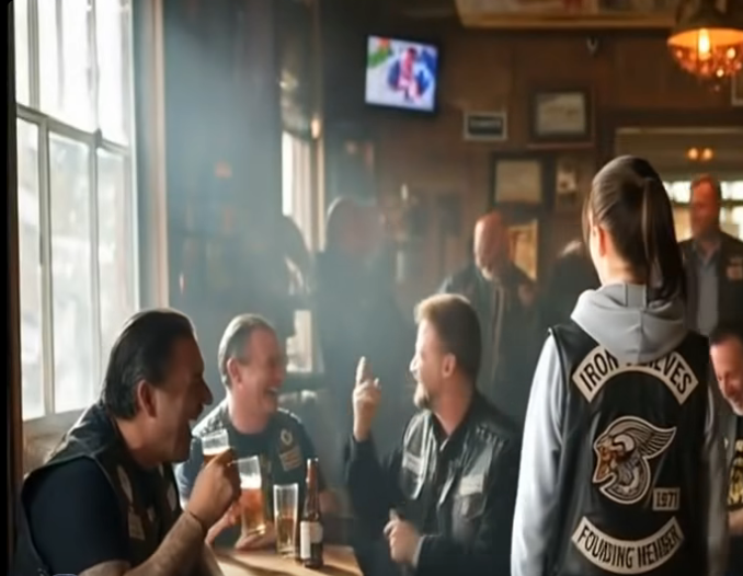 When seventeen-year-old Cassie stepped into Rusty’s Bar — a place thick with smoke, leather, and the kind of silence that follows danger — she looked wildly out of place. Five feet tall, clutching a notebook instead of a beer, she barely made it two steps in before the bikers’ laughter rose around her like a wall. To them, she was just a kid. A curiosity. A mistake. But what they didn’t know was that Cassie carried a story stitched into her heart — and a legacy stitched onto the back of a jacket that would soon silence an entire room.