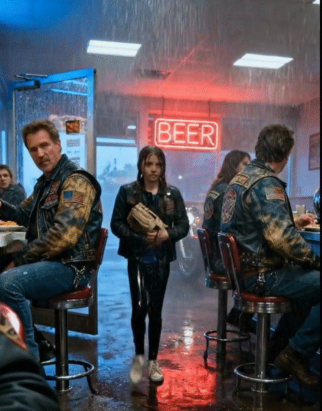 Forks paused. Conversations hung mid-sentence. Booths full of people who looked like they were born in leather and gasoline slowly turned to see her.