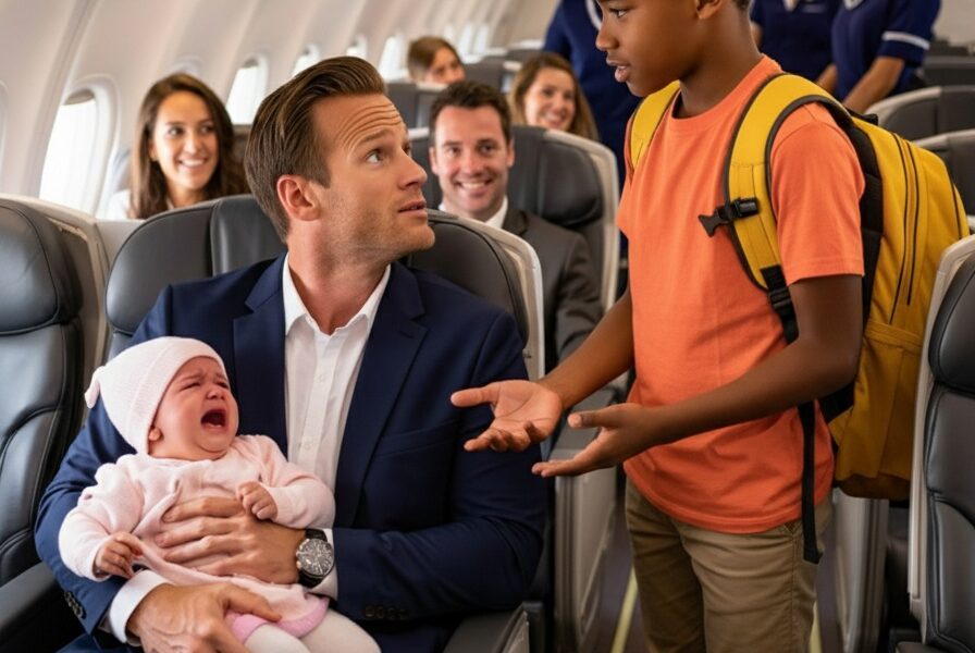 Then a soft voice rose from economy, unexpected and steady: “Excuse me, sir… I think I can help.” Everyone turned. Approaching them was a Black teenager no older than sixteen. His sneakers were worn, his backpack faded, but his eyes held a calm far beyond his years. “My name is Mason,” he said gently. “I take care of my little sister. I know what to do.” Henry froze—every instinct told him to keep control—but Nora’s desperate sobs pierced straight through him. Desperate, he nodded. Mason stepped forward with tender confidence, lifted the baby, and began rocking her, softly humming a melody that seemed to carry peace inside it. Within minutes, the impossible happened: Nora fell asleep. The cabin fell silent. Henry felt his throat tighten as relief washed over him.