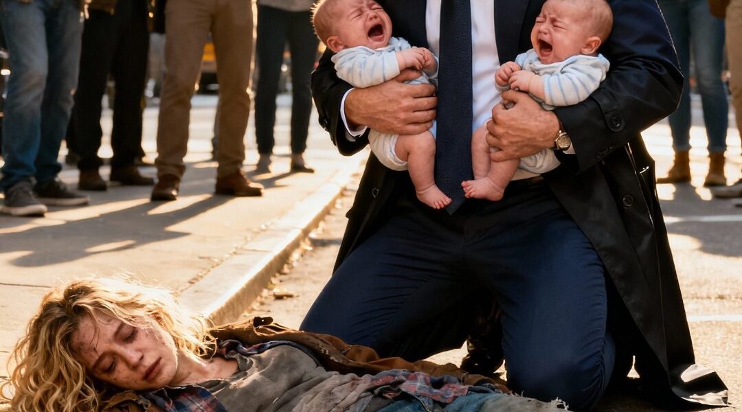 A homeless woman collapsed on the side of the road, her two-year-old twins crying helplessly beside her — until a billionaire stopped to help and froze when he saw the kids looked exactly like him…