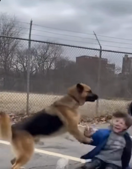 It screeched to a stop between the boy and the dog, and the biker dismounted in one swift motion.