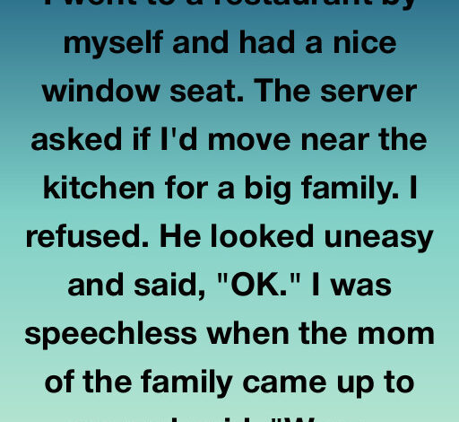 I went to a restaurant alone and got a nice seat by the window. A server asked if I’d move so a big family could sit together. I said no. A few minutes later, the mom approached me and said, “Wow… you must really need this seat.” Not rude, but not kind either. I explained I’d had a long day and just wanted quiet. She nodded and went back to her family, who squeezed into smaller tables. Guilt settled on me like fog.