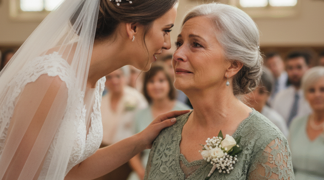 The church shimmered with elegance. Guests sparkled in designer gowns and tailored suits. I felt painfully ordinary.